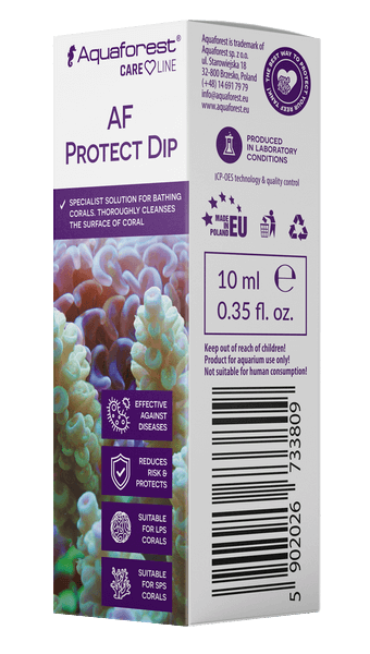 Dosage: Carry out the bath out of the tank. Shake before use. Dissolve 2.5 ml AF Protect Dip in 5 litres of saltwater or water taken directly from the tank. Immerse the coral in the prepared solution and gently clean its surface by rinsing with water or using a toothbrush. The bath should take up to 5 minutes. To rinse, transfer the coral into a container filled with clean saltwater. Transfer the cleaned coral back into the tank. Once used, the solution may not be reused. Do not pour the solution into the aquarium. Coral dipping should be performed outside of the main tank. Not suitable for human consumption.