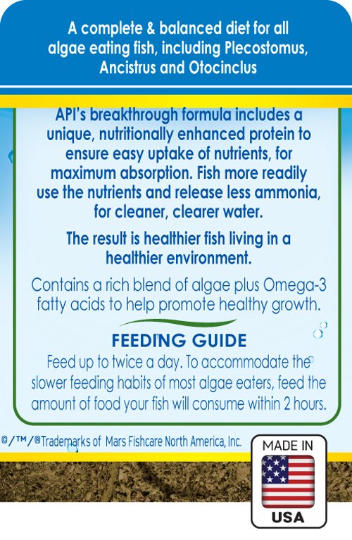 API® ALGAE EATER WAFERS contains a rich blend of algae, plus Omega 3 fatty acids, to help promote healthy growth and development. Alfalfa, a good source of fiber for optimal digestive function, is also included in our high-quality formula. API ALGAE EATER WAFERS is designed specifically for algae-eating fish, and contains a unique, nutritionally-enhanced protein to ensure easy uptake of nutrients for maximum absorption. Fish more readily use the nutrients in our high-quality formula, and as a result, release up to 30% less ammonia than the leading competitor for cleaner, clearer water.