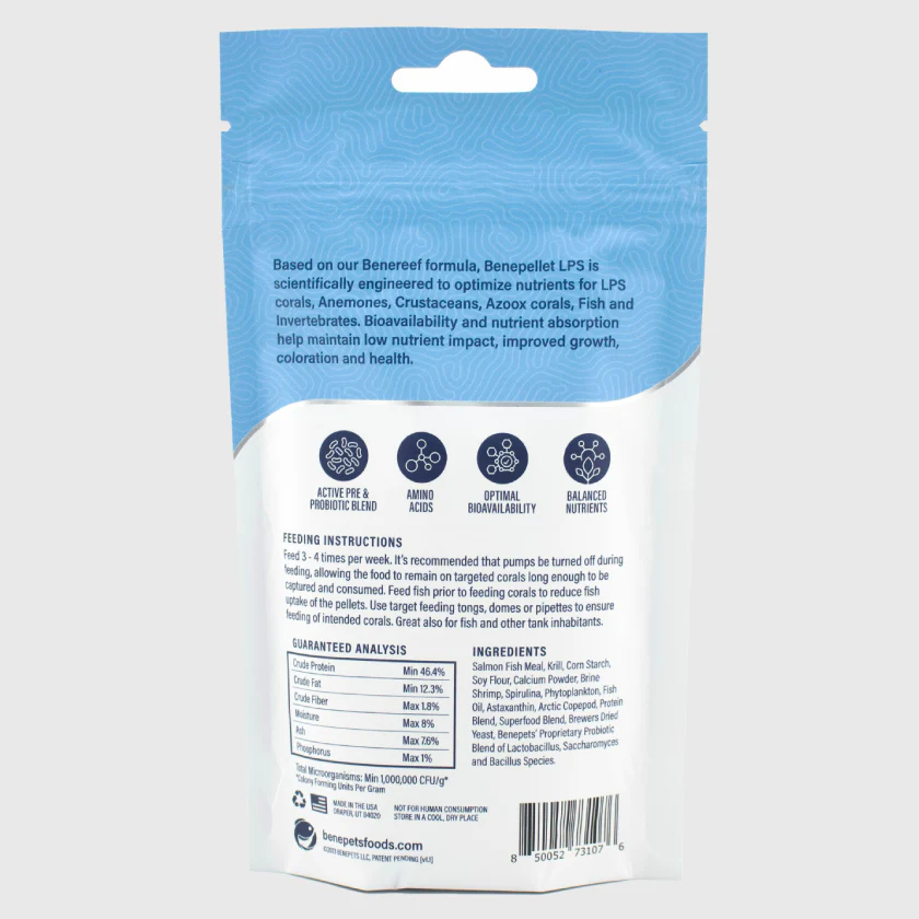 Salmon Fish Meal, Krill, Zea mays amylacea, Glycine max, Calcium Powder, Brine Shrimp, Spirulina, Phytoplankton, Fish Oil, Astaxanthin, Arctic Copepod, Protein Blend, Superfood Blend, Saccharomyces cerevisiae, Benepets’ Proprietary Probiotic Blend of Lactobacillus, Saccharomyces and Bacillus Species.