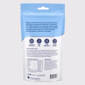 Designed for manual target feeding. The BenePellet LPS pellet is based on the BeneReef microbiomic formula providing a blend of patent-pending prebiotics and probiotics, beneficial bacterias, proteins, and superfoods to maximize consumption and absorption.