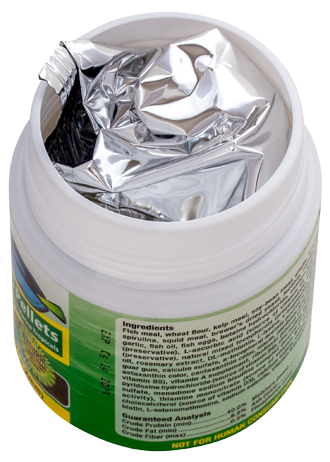 Fish meal, wheat flour, kelp meal, soy-bean meal, alfalfa, krill meal, spirulina, squid meal, brewer’s dried yeast, lecithin, shrimp meal, garlic, fish oil, fish eggs, betaine hydrochloride, calcium propionate (preservative), L-ascorbic acid (source of vitamin C), citric acid (preservative), natural mixed tocopherols (preservative), vegetable oil, rosemary extract, DL-methionin, L-lysine, L-tryptophan, taurine, guar gum, calcuim sulfate, a-tocopheral acetate (source of vitamin E), astaxanthin color, cantaxanthin color, niacin, panthinic acid (source of vitamin B5), vitamin A supplement, riboflavin (source of vitamin B2), pyridoxine hydrochloride (source of vitamin B6), zinc sulfate, manganese sulfate, menadione sodium bisulfite complex (source of vitamin K3 activity), thiamine mononitrate (source of vitamin B1), folic acid, cholecalciferol (source of vitamin D3), calcium iodate, copper sulfate, biotin, L-selenomethionine, sodium selenite, vitamin B12 supplement.