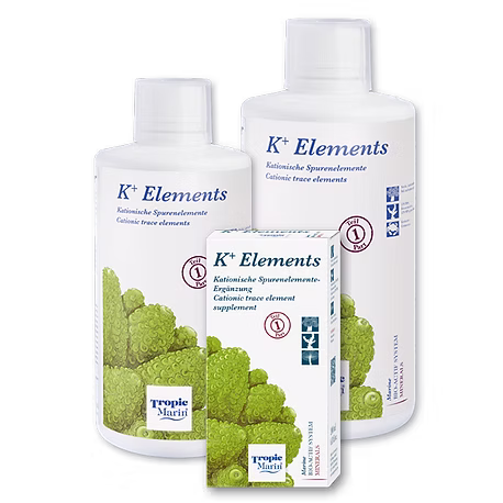 We recommend using Tropic Marin® K+ Elements (part 1: essential catatonic trace elements) and Tropic Marin® A- Elements (part 2: essential anionic trace elements) to ensure a complete supply of trace elements.