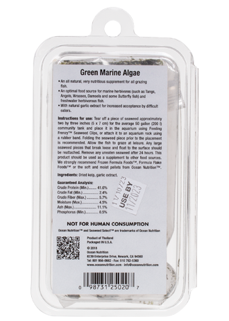 Seaweed Selects Marine Algae are natural foods rich in vitamins and minerals that are ideal for the daily feeding of herbivorous fish – those whose natural diet is partly or entirely algae. The addition of garlic extract creates an appealing flavor that entices even the most finicky eaters. Furthermore, Seaweed Selects are 100% digestible, so your fish absorbs a maximal amount of the food and excretes less of it as waste. This means less aquarium clean-up for you! For complete balanced nutrition, we highly recommend feeding Seaweed Selects in combination with Ocean Nutrition Formula Foods.