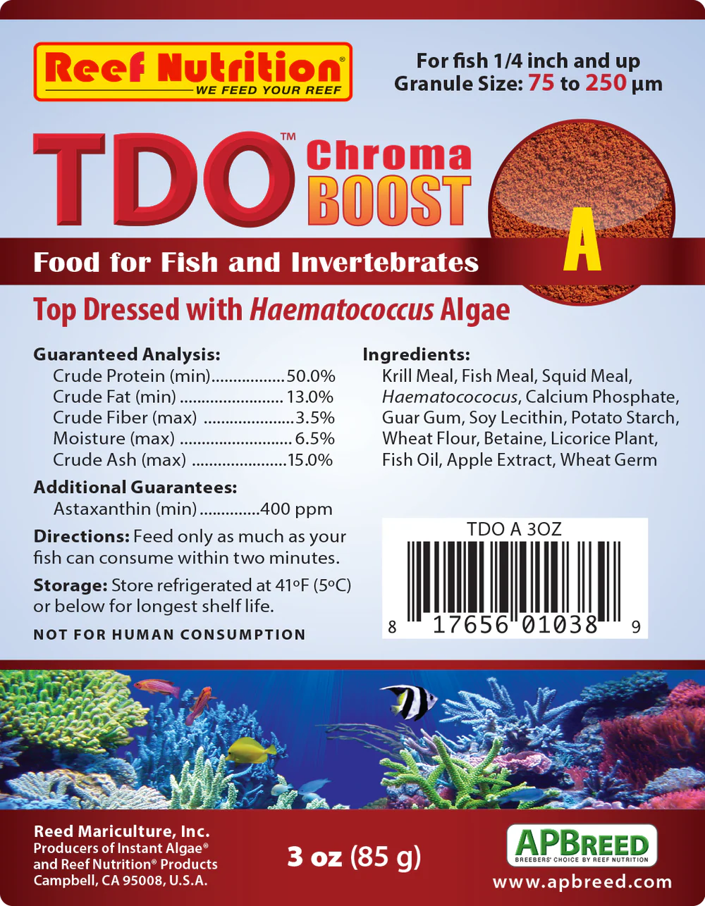 TDO™ Chroma Boost is a granulated and pelleted fish and coral feed “top-dressed” with Haematococcus (which provides an excellent source of astaxanthin) for vibrant color and superior nutrition.
